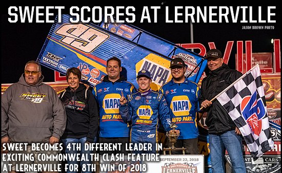 SARVER, PA – September 23, 2018 - Brad Sweet’s fantastic 2018 season continued Saturday night at Lernerville Speedway when he passed Donny Schatz on Lap 28 to become the fourth and final different leader of the 2018 Commonwealth Clash for his eighth win on the year. Schatz settled for second with former Lernerville track champion Tim Shaffer completing the podium.
