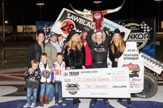 FT. WORTH, Texas (April 7, 2018).. Making his first trip to Victory Lane at the Texas Motor Speedway, Oklahoma's Brady Bacon notched his 14th career win with the Lucas Oil American Sprint Car Series presented by Sawblade.com at Tony Stewart presents the Vankor Texas Sprint Car Nationals.