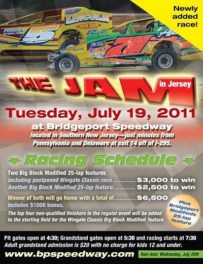 BRIDGEPORT, NJ (July 19, 2011) - Heavy rains pounded the grounds at Bridgeport Speedway as cars and fans were filing in on July 19 for the Jam in Jersey. Due to the wet weather, the Jam in Jersey race was postponed and will now take place on Wednesday, July 20 at 7:30 PM.