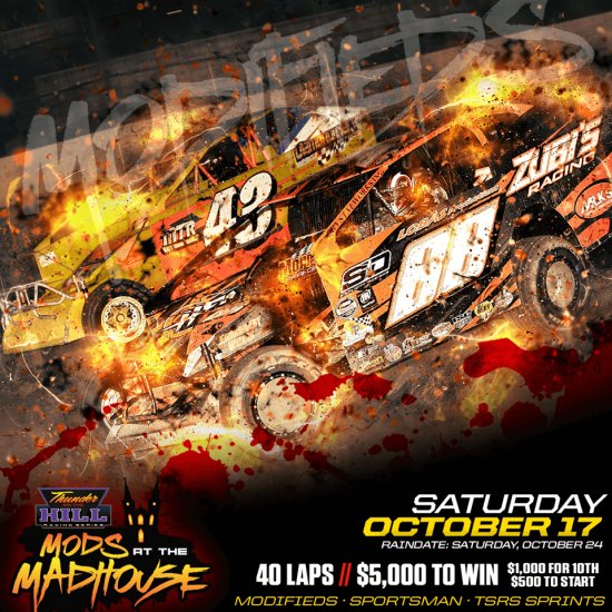 A frightening chill and an eerie darkness will fall across Grandview Speedway on Saturday, October 17 (Rain date: Saturday, October 24) as the NAPA Auto Parts Thunder on the Hill Racing Series presents Mods at the Madhouse, a thrilling three-division show headlined by a Small-Block/Big-Block Modified event -- including full qualifying heat races - plus action from the Sportsman and TSRS Sprint Cars. Race time is set for 6 PM.