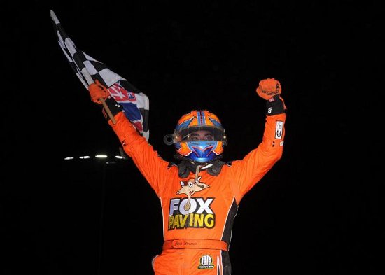 Kody Swanson celebrates after scoring his record-setting 24th career USAC Silver Crown win Saturday night at Indiana's Salem Speedway in the 59th running of the 'Joe James/Pat O'Connor Memorial.' (Rich Forman Photo)