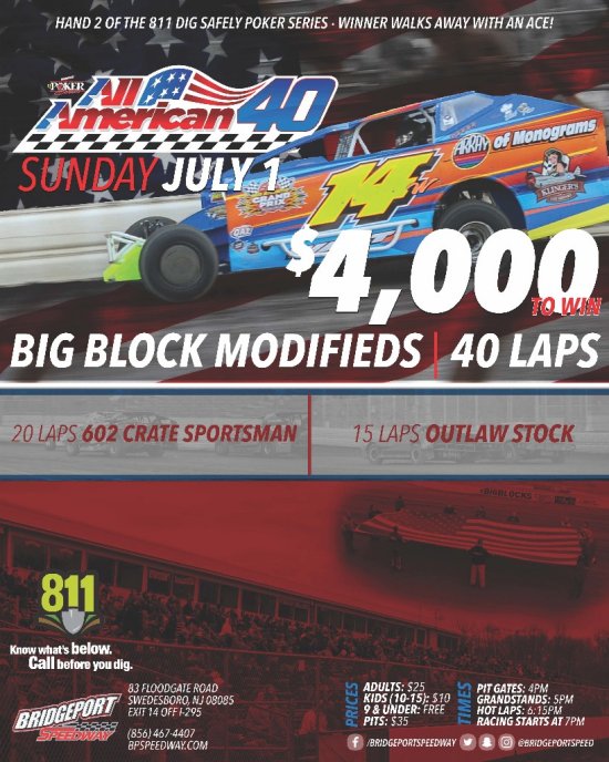 Calling all patriots! Come spend your holiday weekend with us on Sunday July 1st as Colonial Pipeline Co. brings you The All American 40 Hand 2 of the 811 Dig Safely Poker Series. You will get to see fierce Spirit Auto Center Big Block Modified competitors like local sensations Flyin' Ryan Watt, Sammy Martz, Brett Kressley, Billy 'The Kid' Pauch and more battle it out against invaders like Duane Howard, Frank Cozze, Ryan Godown, Jamie Mills, Jordan Watson, and others. Plus the Stewart Stainless Crate/Sportsman, and Pennco Tech Outlaw Stocks will be on hand as well all brought to you by Lyon's Construction