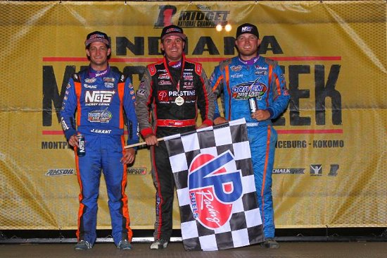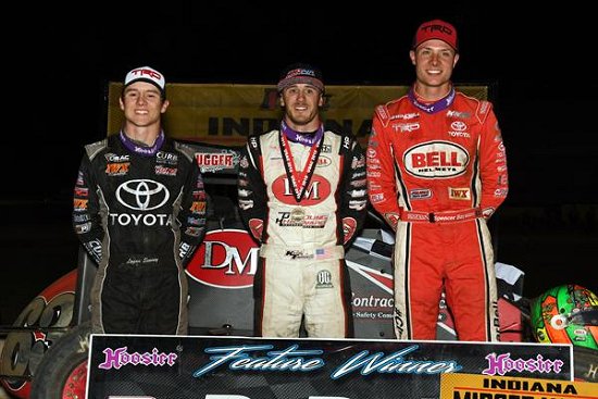 Feature winner Kevin Thomas, Jr. (middle), Indiana Midget Week champion and 2nd place finisher Spencer Bayston (right) and 3rd place finisher Logan Seavey (left) pose in victory lane following Sunday's IMW finale at Kokomo Speedway. (David Nearpass Photo)
