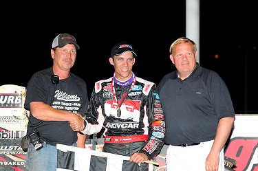 The race once again became real interesting with just five laps to go as Coons and Darland were reeling in race leader Bryan Clauson. With just two laps to go, the top three were racing under a blanket and on the white flag lap, Coons made a run for the lead. Coons had to check-up as Darland used the fast lane to challenge for second. On the final lap heading into turn three, the crowd went to their feet watching the three car race for the win. Clauson held on to take the victory was Jerry Coons second, Dave Darland third, Damion Gardner fourth and Levi Jones fifth.